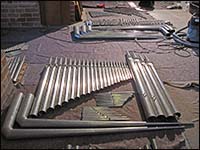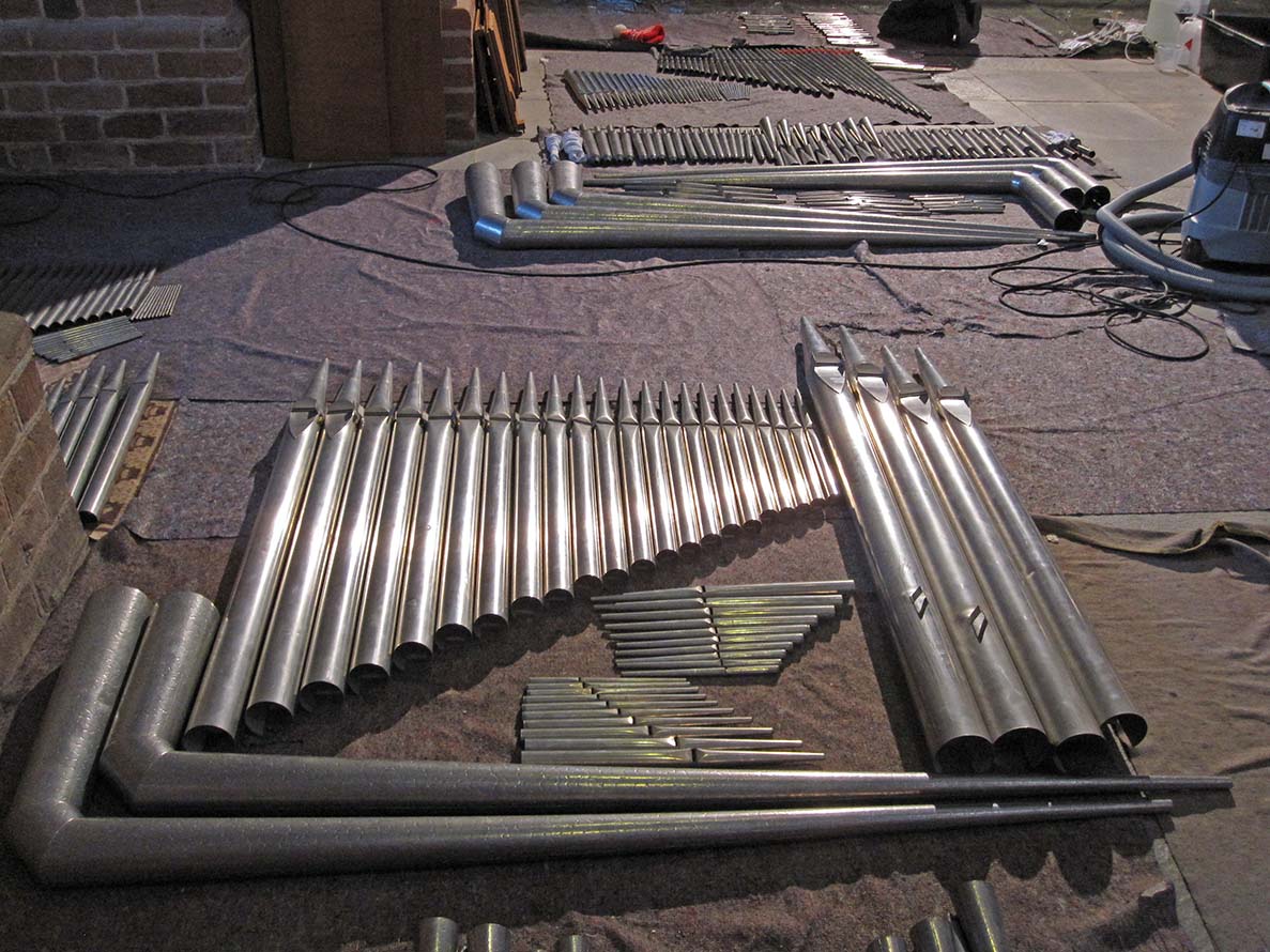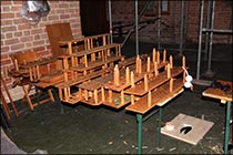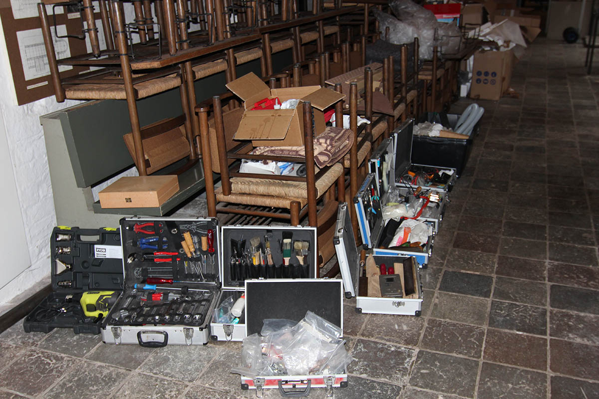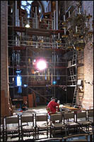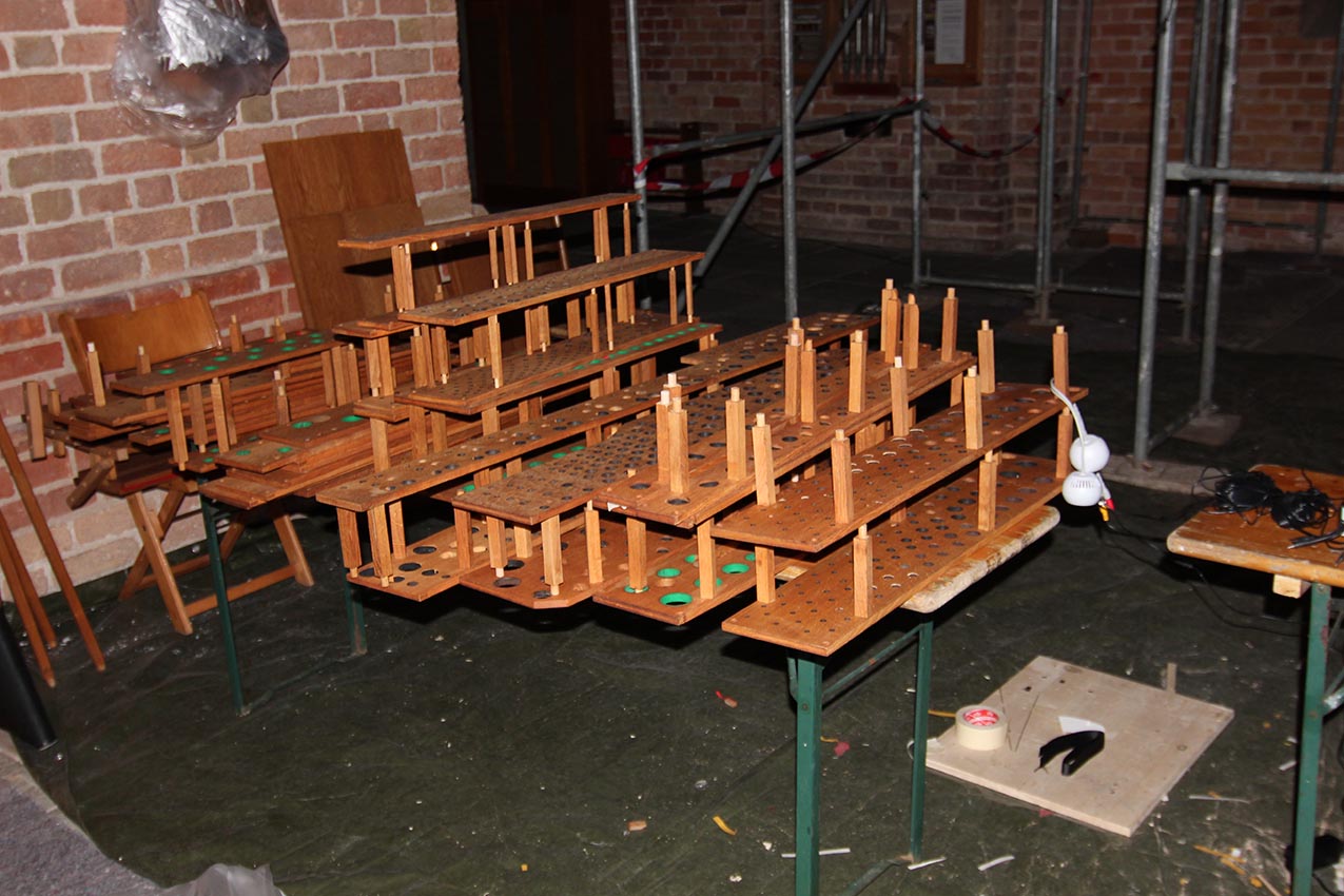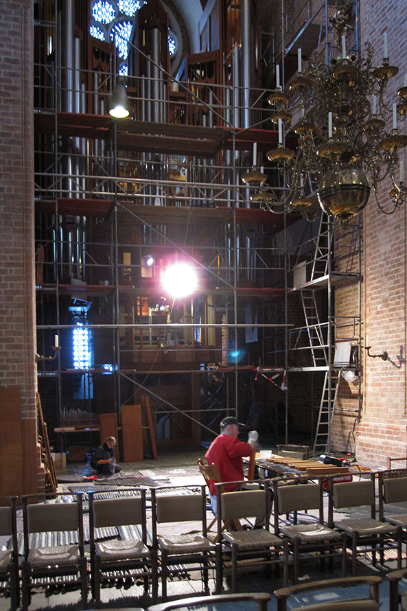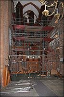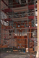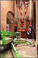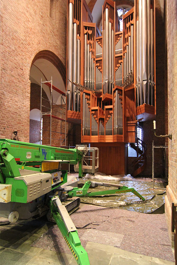 zu sehen: - Die letzten Stuhlreihen im Hauptschiff wurden in die Werkstatt ausgelagert, ein Hubwagen ermöglichte das Streichen der Gewölbe oberhalb der Orgel vor der Sanierung. Der Kirchenfußboden wurde teilweise mit Folie/Textilien ausgelegt. - Der Orgelbereich wurde umfassend eingerüstet, um den uneingeschränkten Zugang zu sämtlichen Bereichen des voluminösen Instruments zu gewährleisten. - Um bei der Vielzahl der unterschiedlichen Registerpfeifen den Überblick zu behalten, wurde ein Bereich des nördlichen Seitenschiffs zur Zwischenlagerung genutzt. Im westlichen Teil des Hauptschiffs lagerten zeitweilig ausgebaute Registerpfeifen. - Die 'Kunstkammer' war belegt mit Stühlen und den Koffer der Orgelbauer(innen) mit ihren Spezialwerkzeugen. Im Folgenden sehen Sie einige Momentaufnahmen, die im Laufe der Renovierungszeit entstanden sind. |